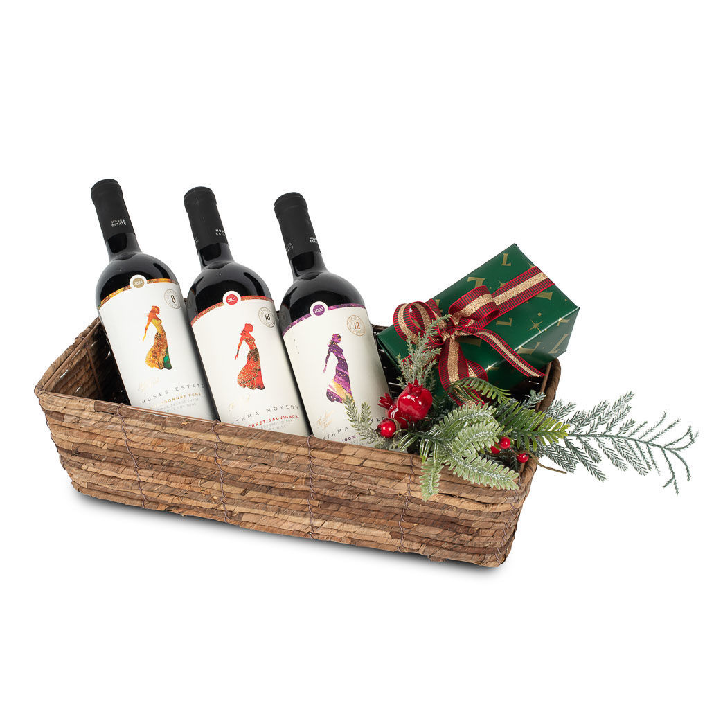 Ψάθινο καλάθι με χριστουγεννιάτικο αμπαλάζ, κρασιά Κτήμα Μπουσών και 500 γρ. σοκολατάκια Leonidas