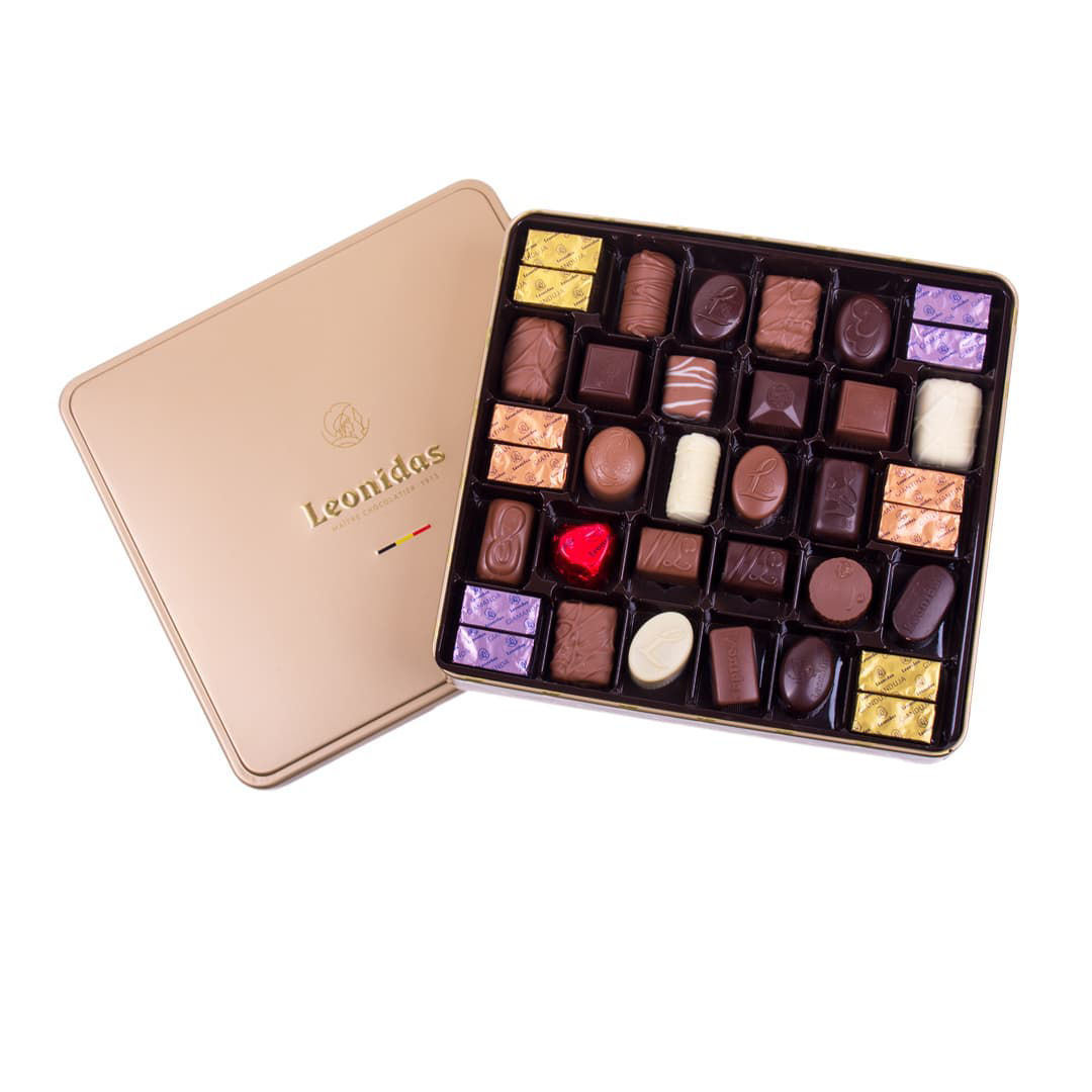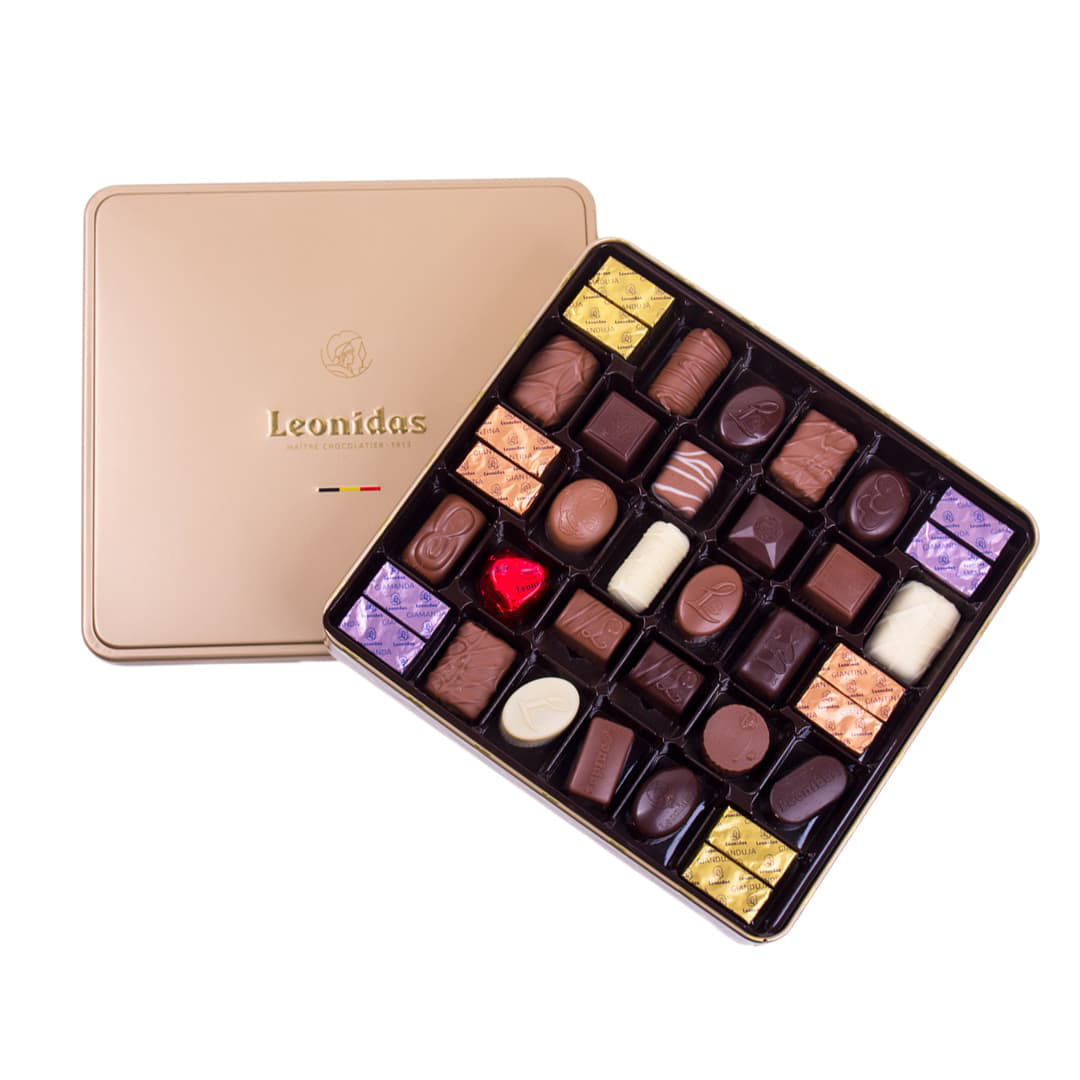 Ποικιλία από 250 γρ. σοκολατάκια Leonidas γάλακτος, υγείας και λευκά με γέμιση από πραλίνα, κρέμα βουτύρου, ganache, καραμέλας, λικέρ, συσκευασμένα στο κλασικό κουτί μπαλοτέν Leonidas!