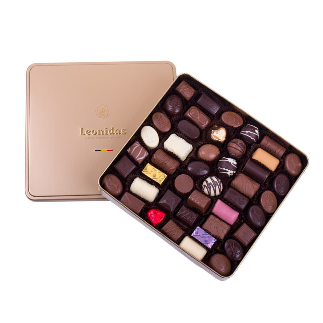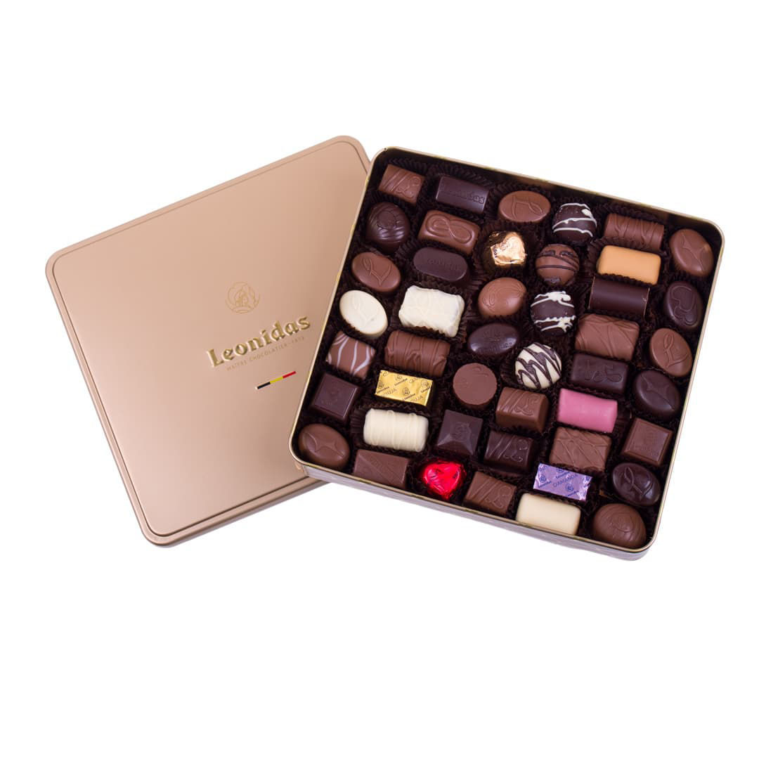 Πολυτελές μεταλλικό κουτί Leonidas, με ποικιλία πραλινών, με λευκή, γάλακτος και σοκολάτα υγείας, σε διαφορετικές γεύσεις για τους πιστούς λάτρεις της σοκολάτας Leonidas, αλλά και όσους θέλουν να δοκιμάσουν για πρώτη φορά την εκλεκτή γκάμα από τις λαχταριστές βελγικές σοκολατένιες συνταγές, με πραλίνα φουντουκιού, καραμέλα, τρυφερή πραλίνα ganache, λικέρ, raspberry ή bitter σοκολάτα, τρούφες (perles), κοκ.