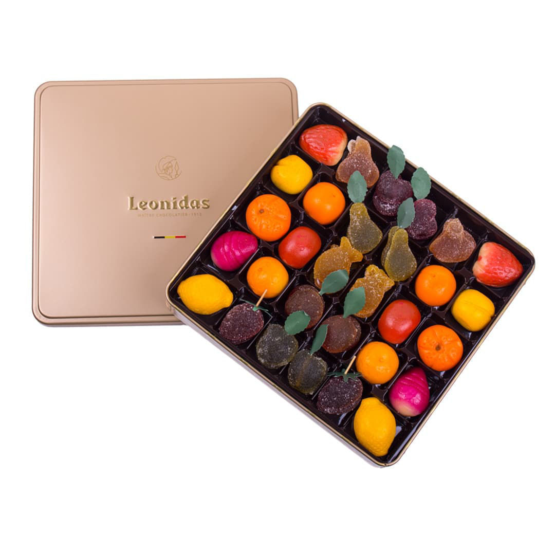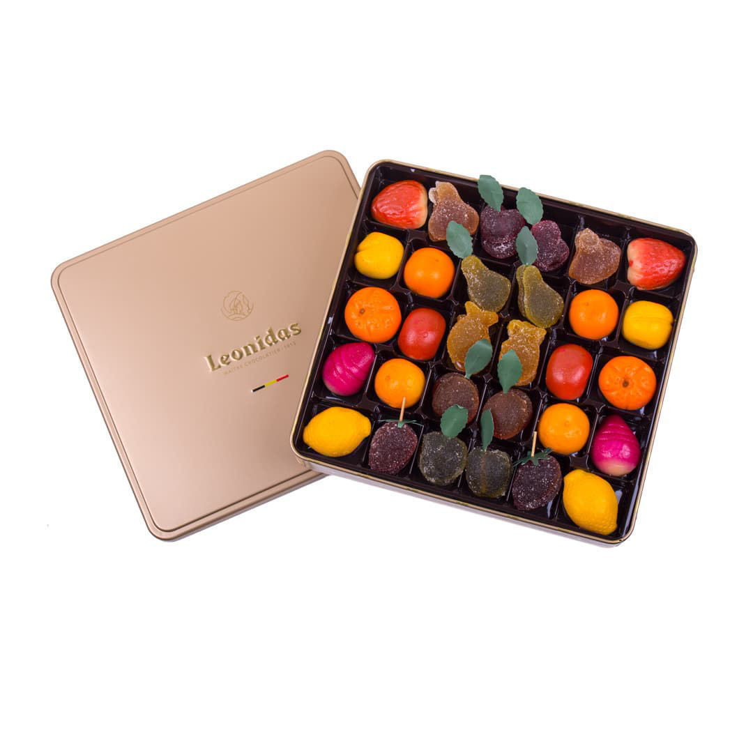 Τετράγωνο χρυσό μεταλλικό κουτί με 800 γρ. αμυγδαλόπαστα (marzipan) και pates de fruit (ζελεδάκια φρούτων) Leonidas