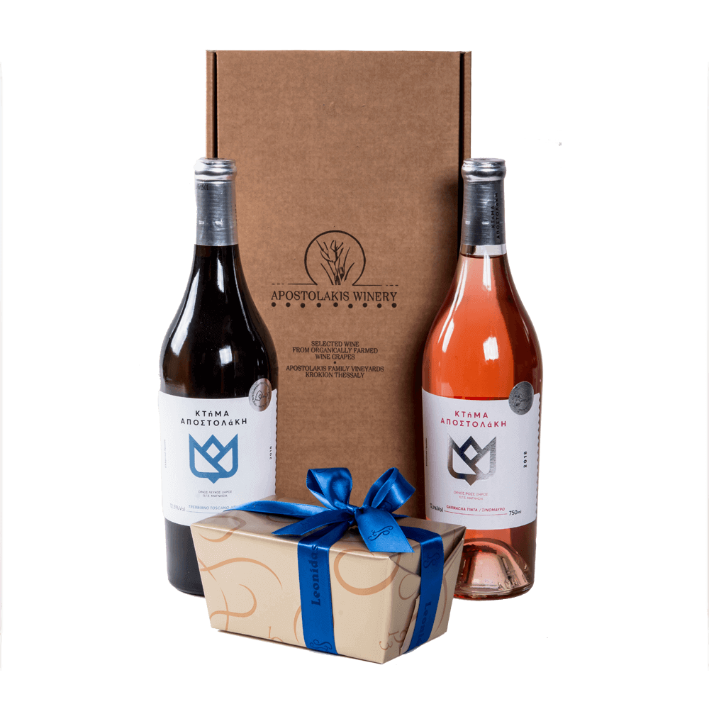 Xάρτινο κουτί με 2 κρασιά Αποστολάκη & 500 γρ. σοκολατάκια Leonidas