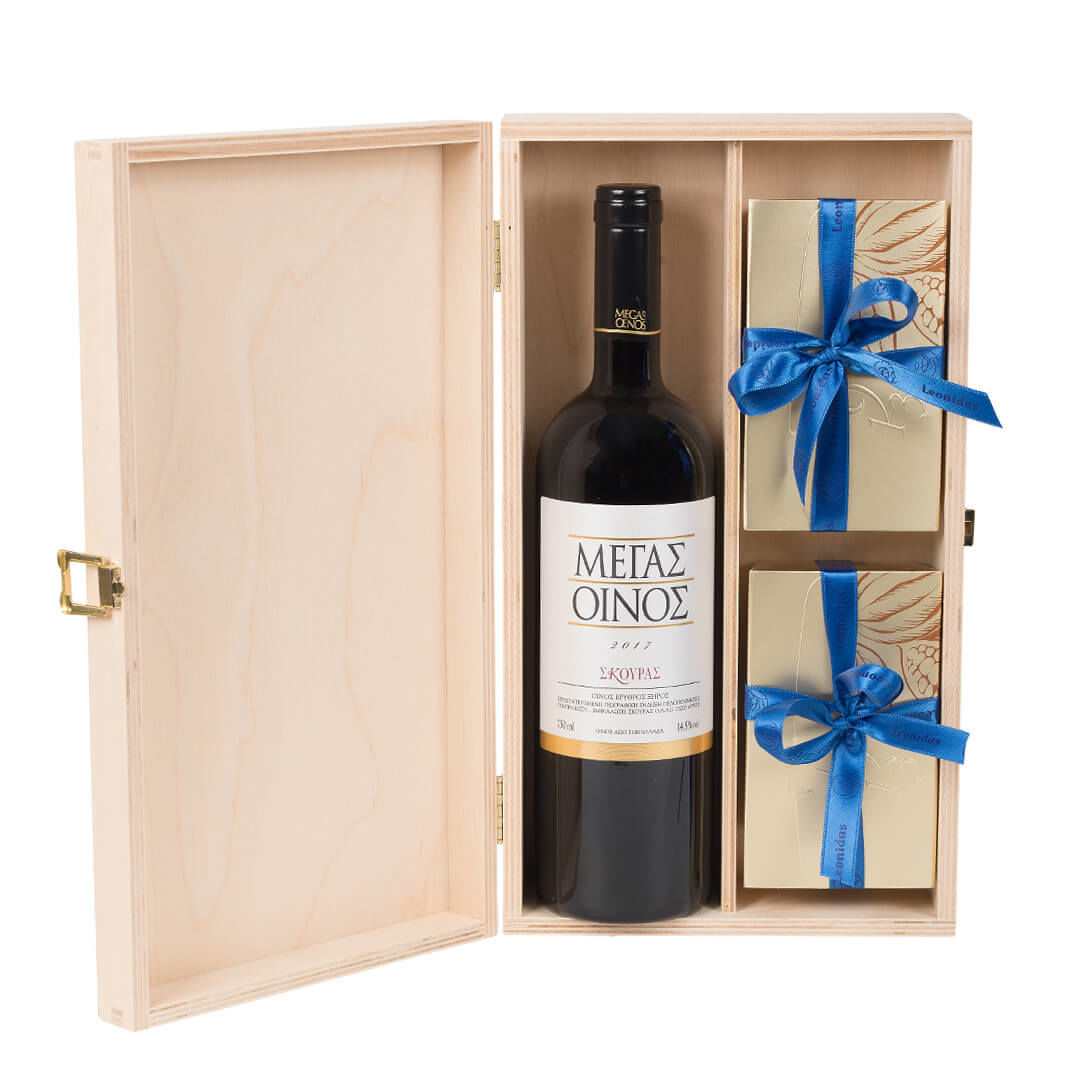 ΞΥΛΙΝΟ ΚΟΥΤΙ ΜΕ ΕΛΛΗΝΙΚΟ ΚΡΑΣΙ ΜΕΓΑΣ ΟΙΝΟΣ ΣΚΟΥΡΑ & ΣΟΚΟΛΑΤΑΚΙΑ LEONIDAS