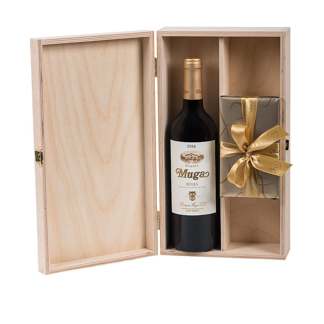 Ξύλινο κουτί με Ισπανικό κρασί MUGA RIOJA Reserva και σοκολατάκια Leonidas