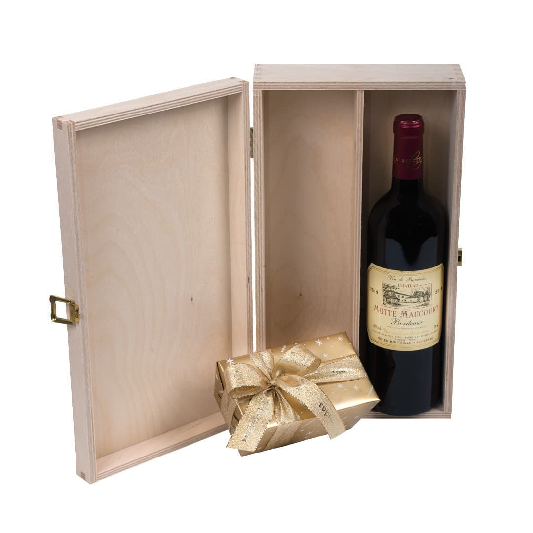 Ξύλινο κουτί με σοκολατάκια Leonidas με Γαλλικό κόκκινο κρασί Chateau Motte Maucourt