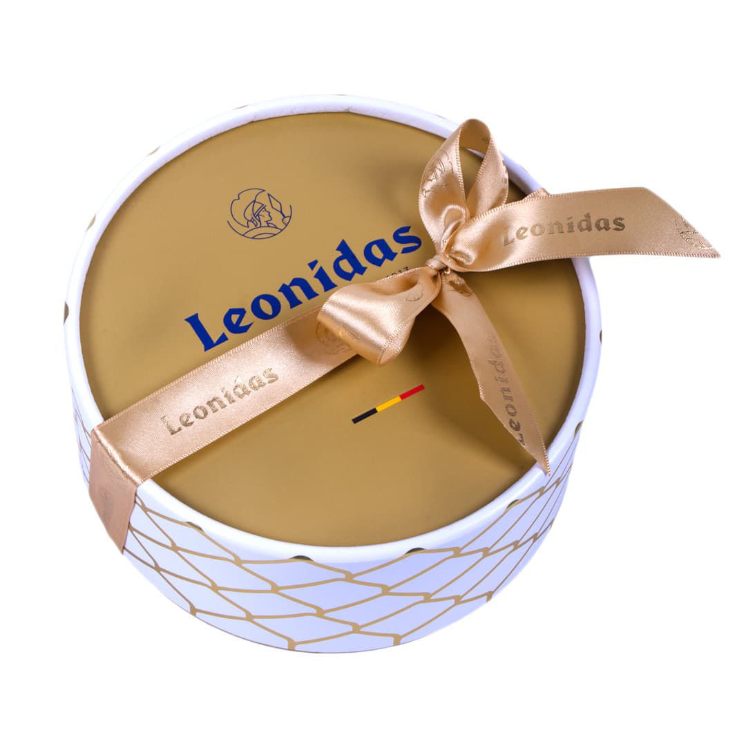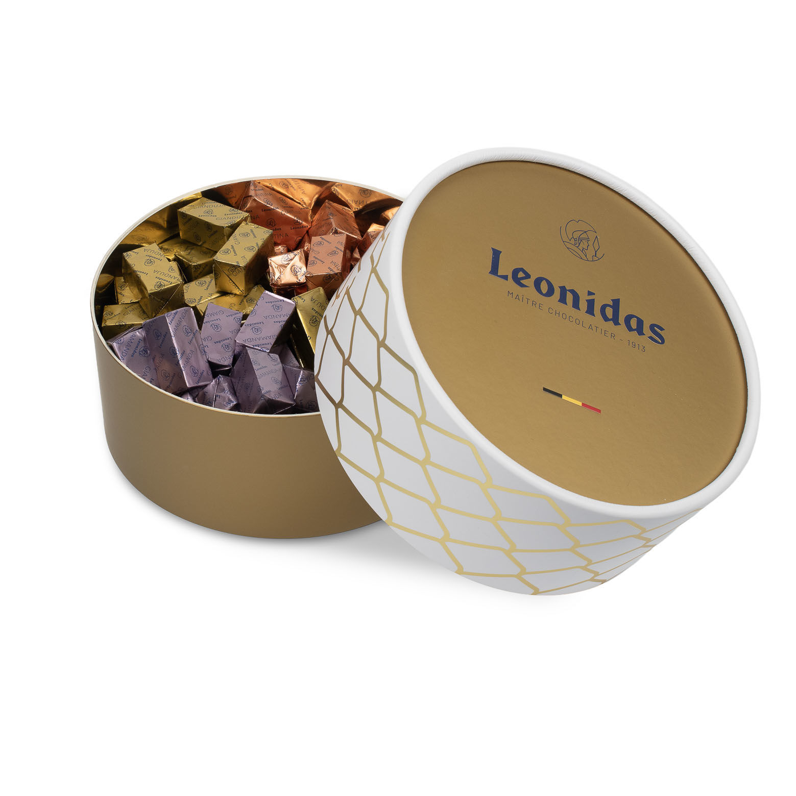 Χάρτινη λευκή καπελιέρα με χρυσό καπάκι και 800 γρ. σοκολατάκια gianduja, giantina, giamanda Leonidas