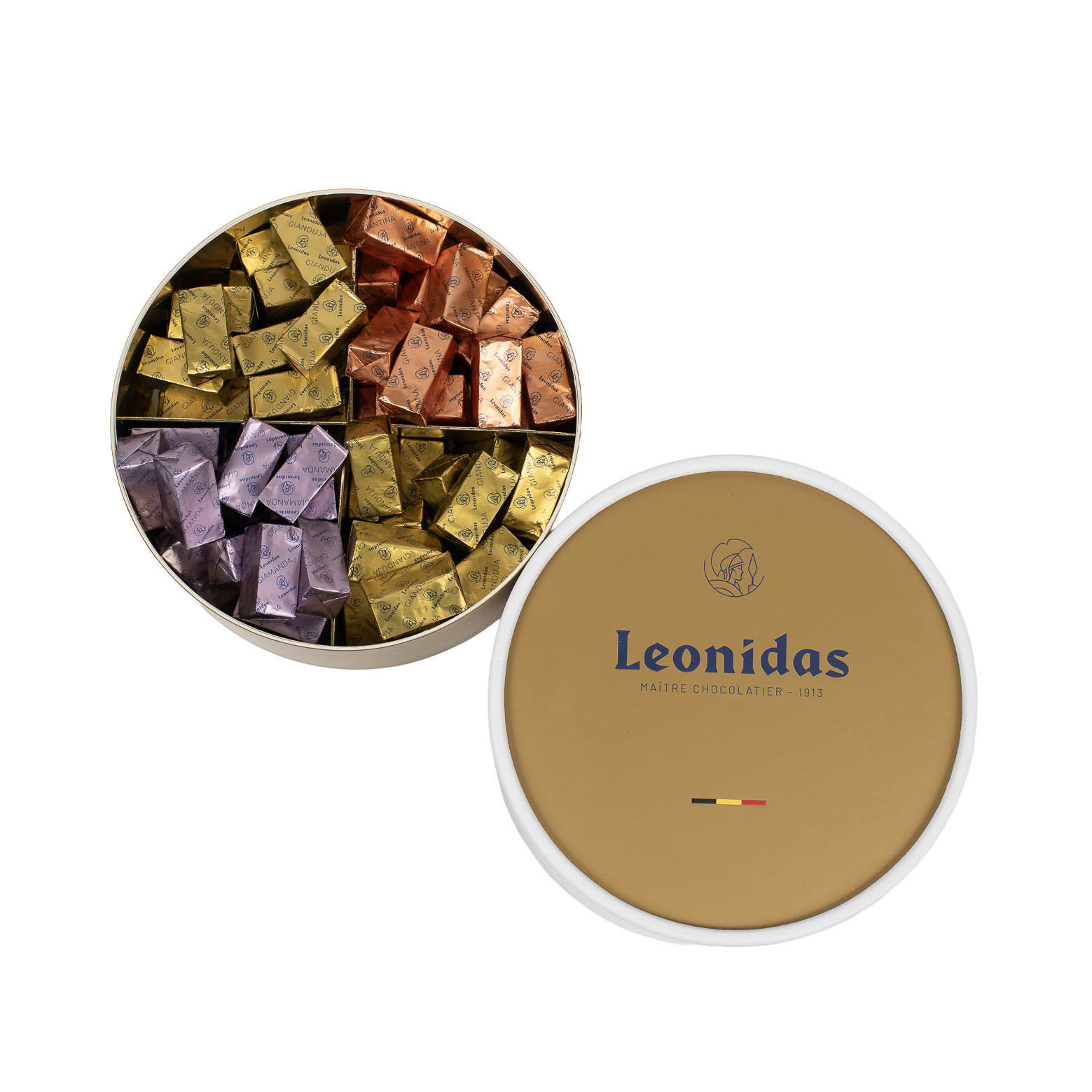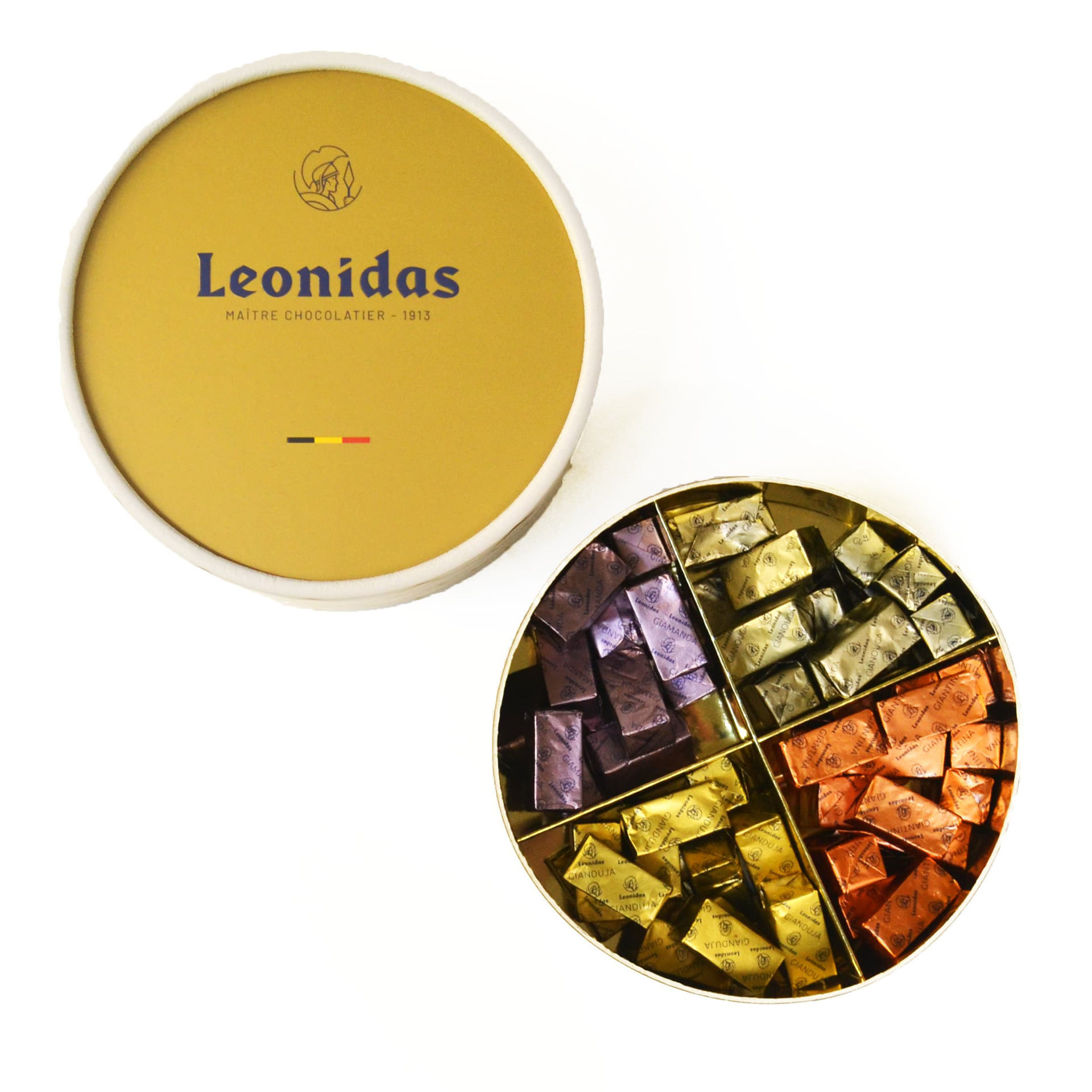 Ποικιλία από 1 κιλό σοκολατάκια Leonidas γάλακτος, υγείας και λευκά με γέμιση από πραλίνα, κρέμα βουτύρου, ganache, καραμέλας, λικέρ, συσκευασμένα στο κλασικό κουτί μπαλοτέν Leonidas!