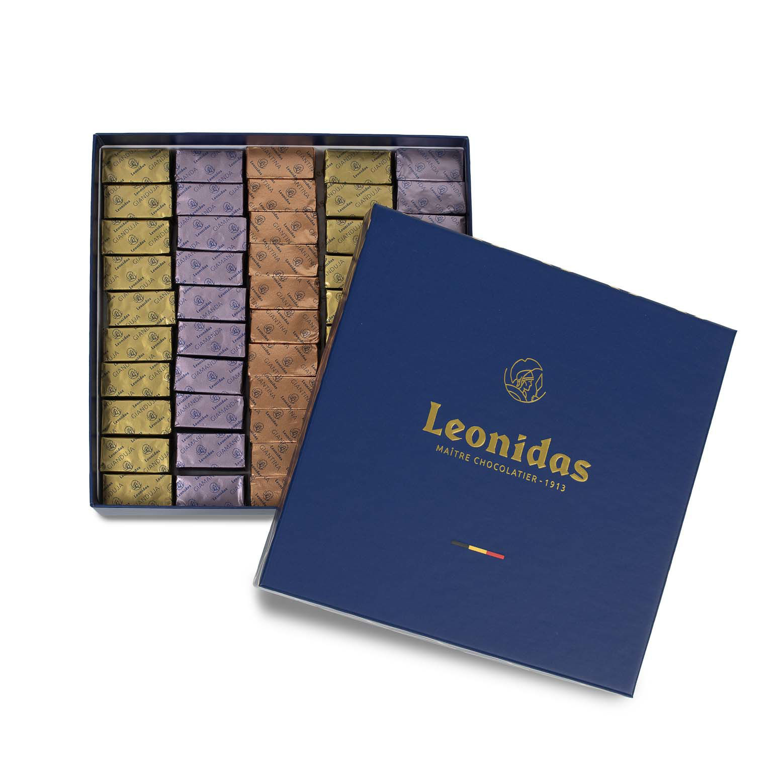 Χάρτινο μπλέ τετράγωνο κουτί Heritage M με 550 γρ. σοκολατάκια Leonidas gianduja, giantina, giamanda - 1 στρώση