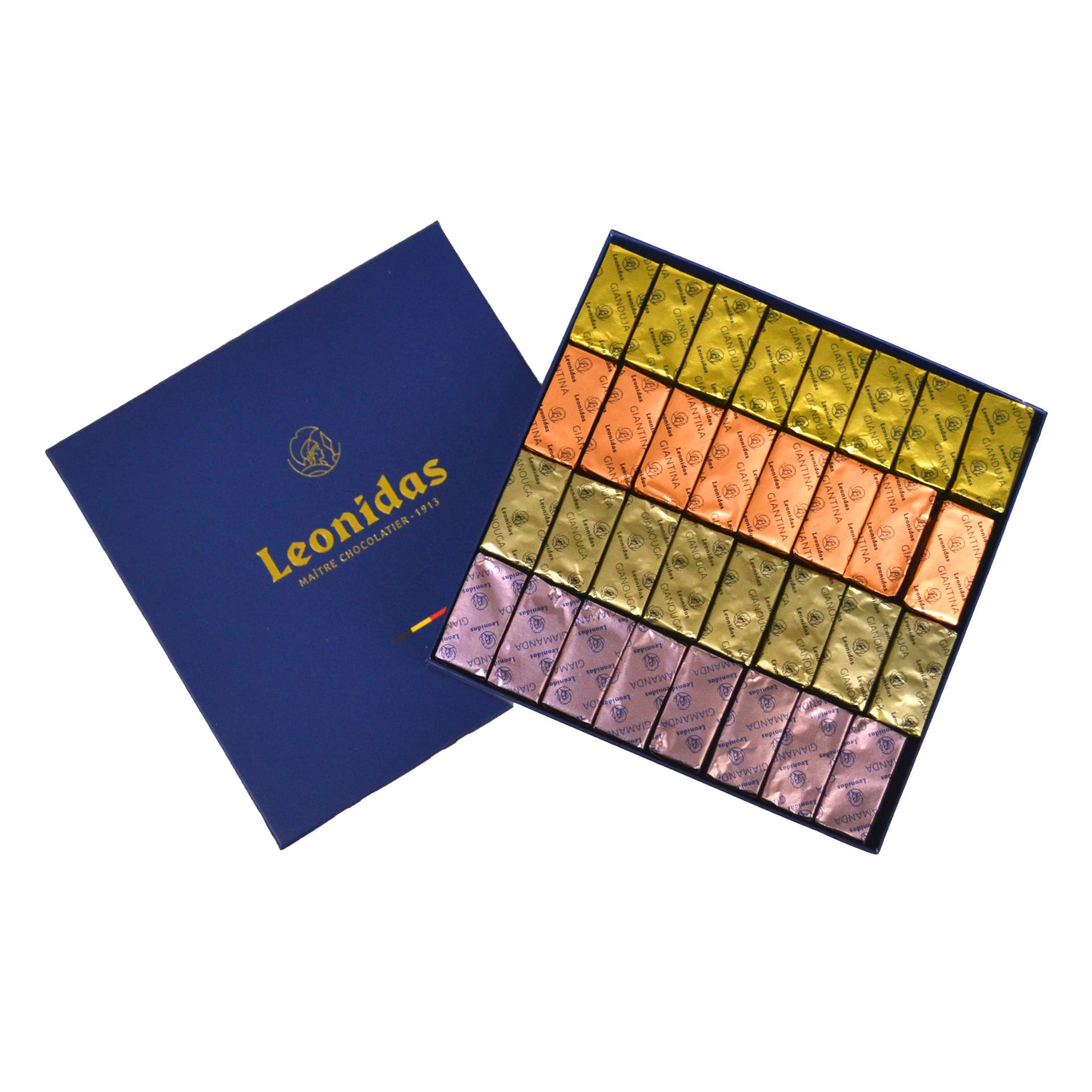 Ποικιλία από 1,5 κιλό σοκολατάκια Leonidas γάλακτος, υγείας και λευκά με γέμιση από πραλίνα, κρέμα βουτύρου, ganache, καραμέλας, λικέρ, συσκευασμένα στο κλασικό κουτί μπαλοτέν Leonidas!