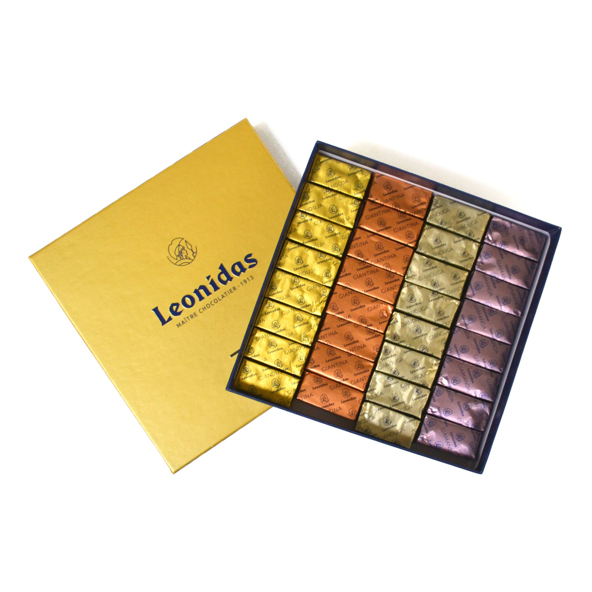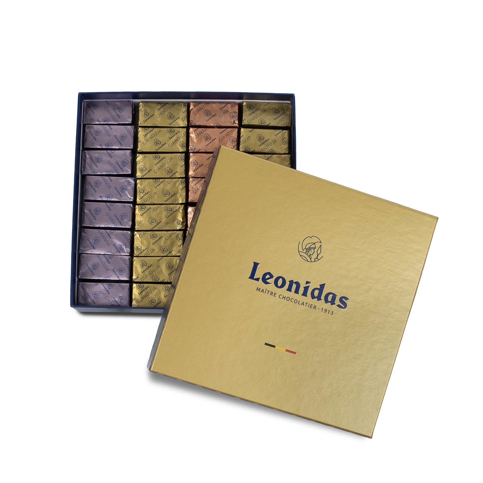 Κομψή, χρυσή κασετίνα πολυτελείας Leonidas με επιλογή τις κλασικές, φημισμένες γεύσεις πραλίνας φουντουκιού Gianduja, Giantina, Giamanda, με την άρτι αφιχθείσα, αλλά εξίσου επιτυχημένη γεύση πραλίνας Gianouga, θα ενθουσιάσει κάθε λάτρη και όχι μόνο της αυθεντικής βελγικής σοκολάτας! - Gianduja (σκέτη πραλίνα φουντουκιού)