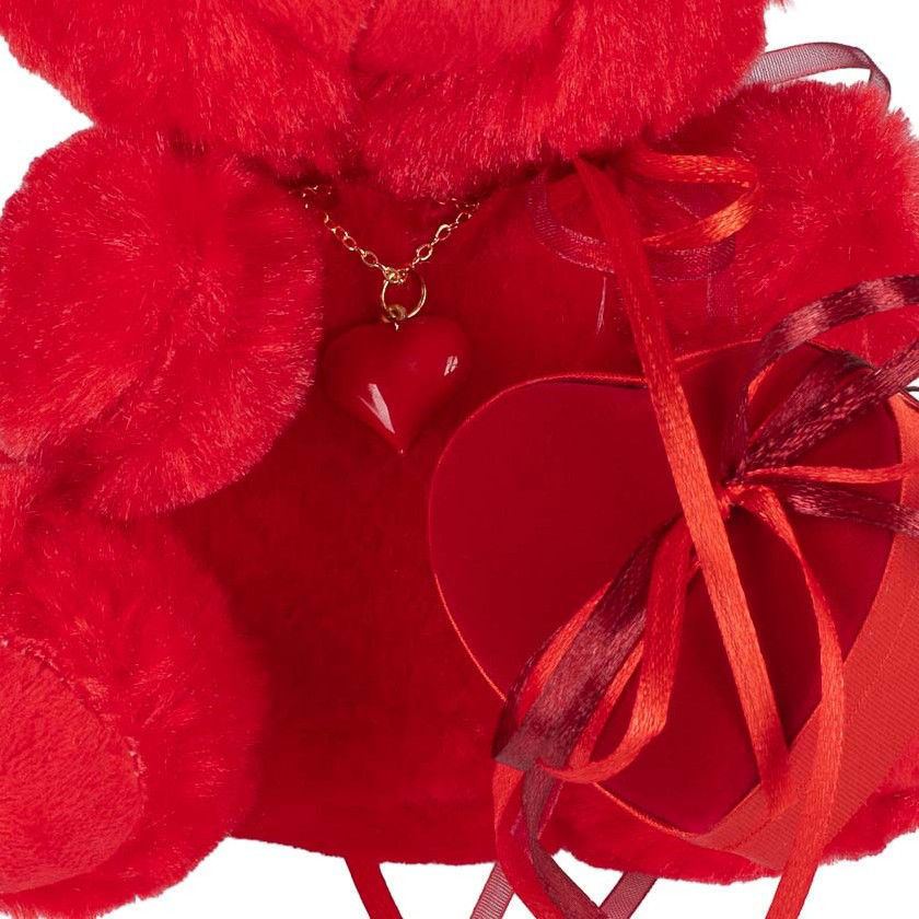 Κόκκινο αρκουδάκι με κολιέ κόκκινη καρδιά και βελούδινη καρδιά με 1 σοκολατάκι Leonidas