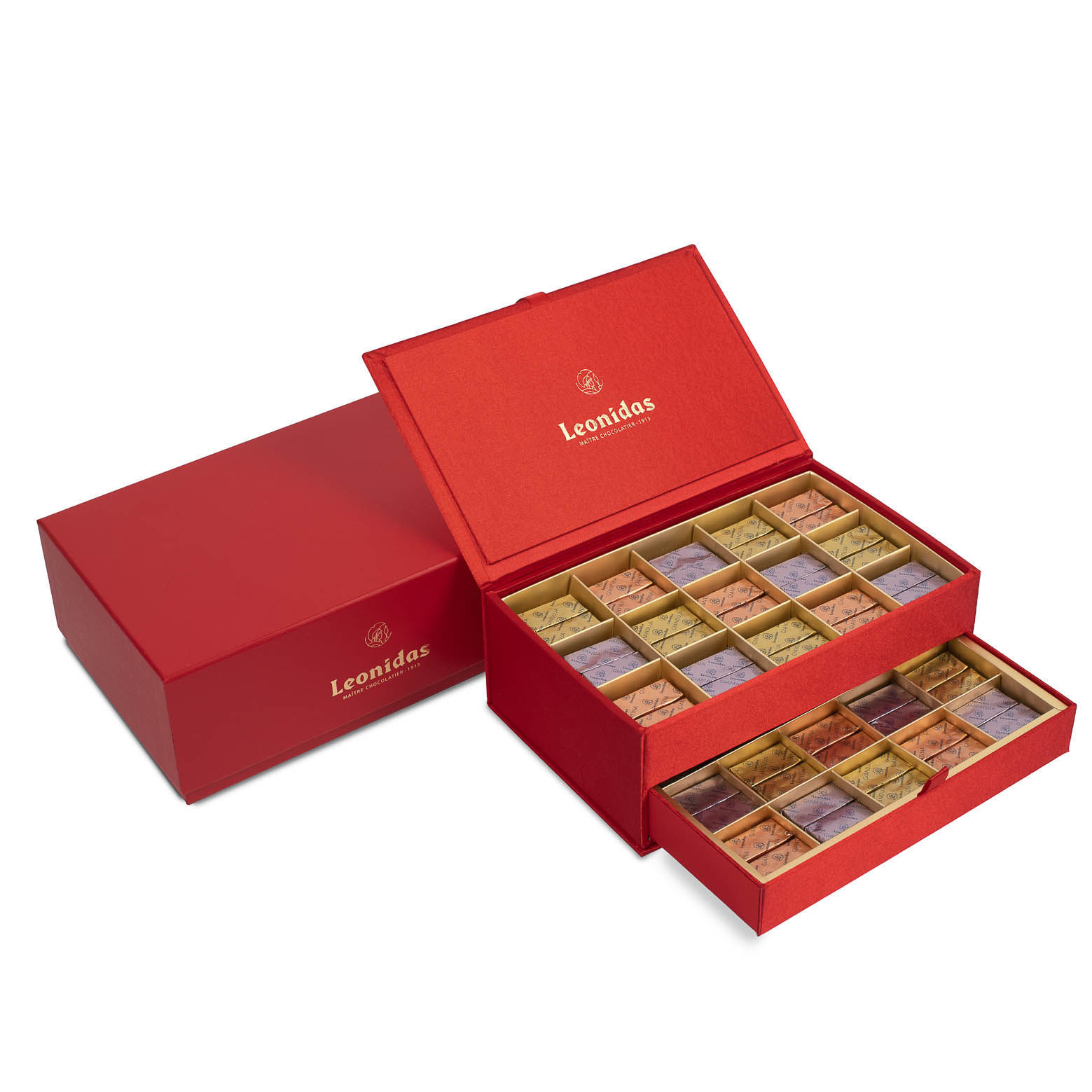 Υφασμάτινη, κομψή, κόκκινη μπιζουτιέρα δύο επιπέδων με 640 γρ. πραλίνες   (Gianduja, Giantina, Giamanda) Leonidas σε ένα ιδιαίτερο κουτί δώρου!