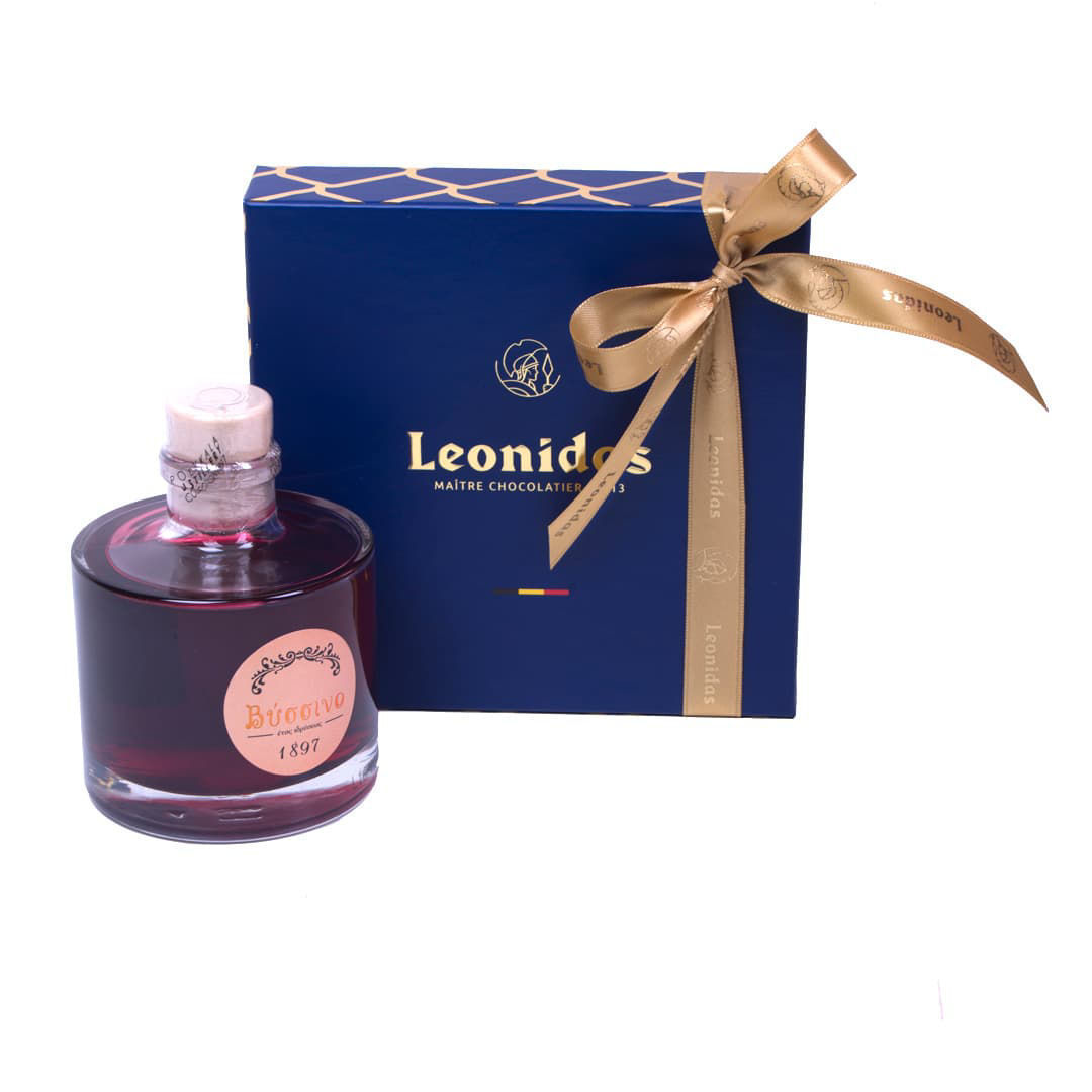 Λικέρ Πολυκαλά Βύσσινο & Χάρτινο μπλέ τετράγωνο κουτί Heritage S με 370 γρ. σοκολατάκια Leonidas gianduja, giantina, giamanda