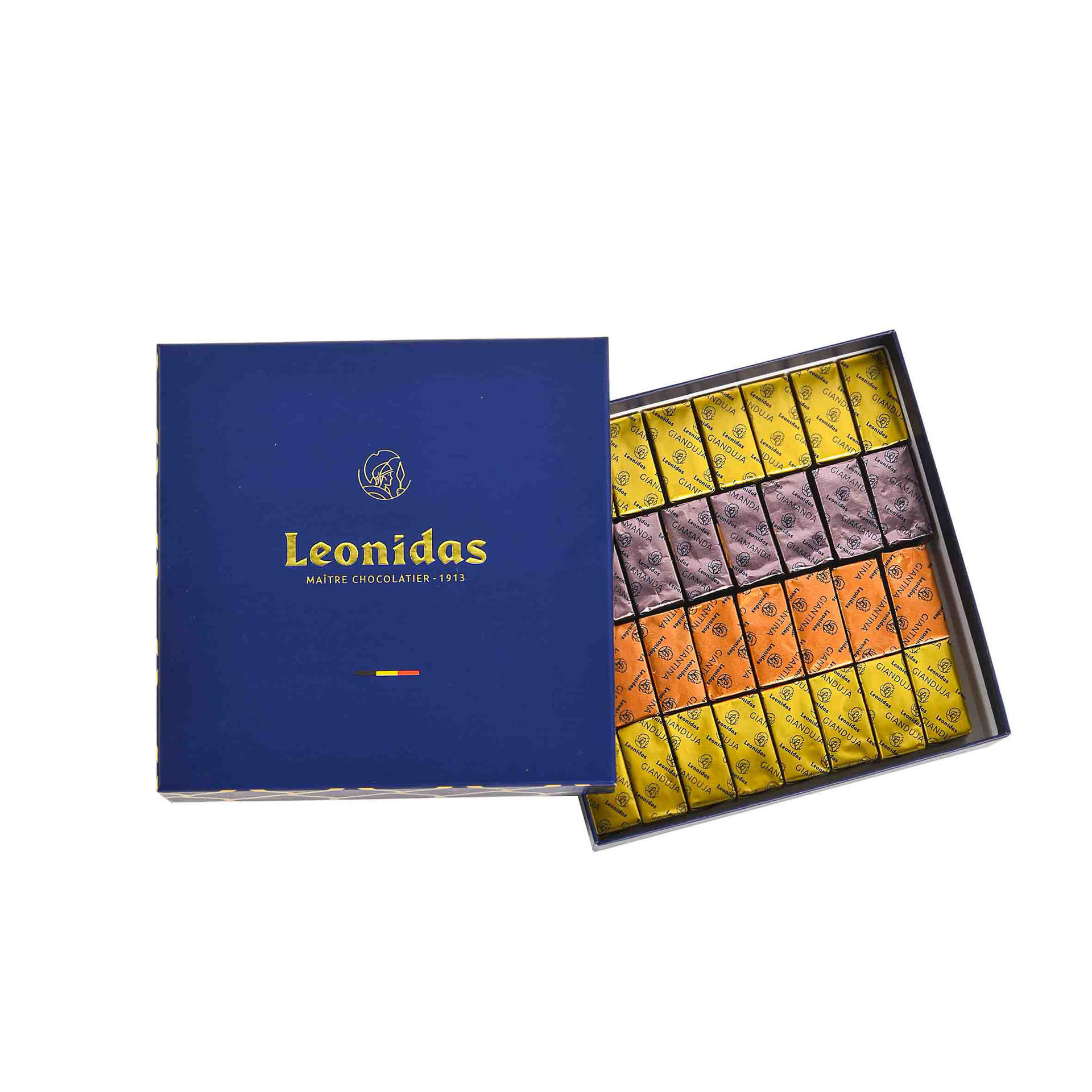 Χάρτινο μπλέ τετράγωνο κουτί Heritage S με 370 γρ. σοκολατάκια Leonidas gianduja, giantina, giamanda