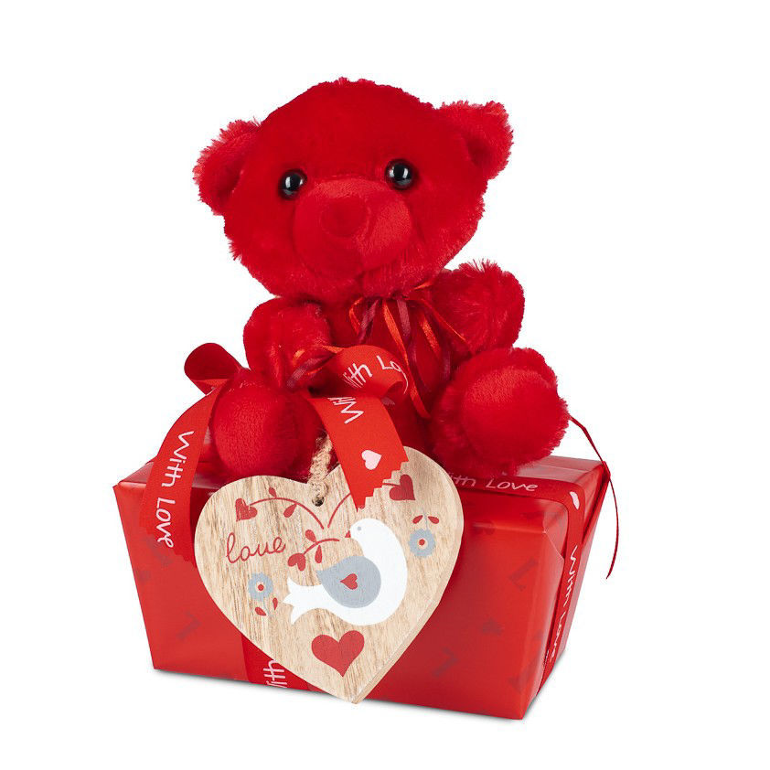 Λούτρινο αρκουδάκι με ξύλινο διακοσμητικό και 750 γρ. σοκολατάκια Leonidas