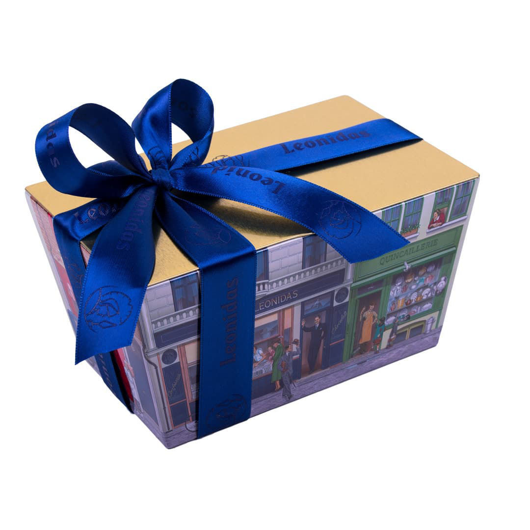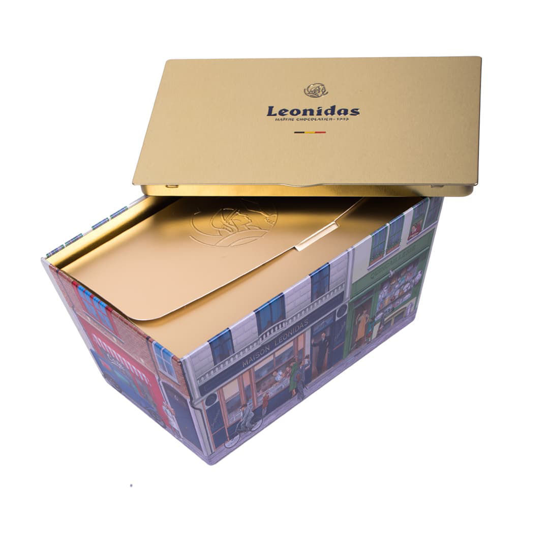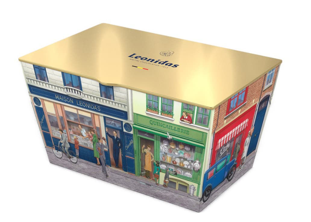 Μεταλλική συσκευασία, με όμορφη εικονογράφηση από ένα παραδοσιακό κατάστημα "Maison Leonidas", δημιουργήθηκε για τον εορτασμό των 110 χρόνων της διάσημης βελγικής σοκολατοποιίας (1913–2023). Περιλαμβάνει κουτί με 800 γρ. πραλίνες Gianduja Leonidas (πραλίνες φουντουκιού), ένα από τα πιο διάσημα προϊόντα της Leonidas.