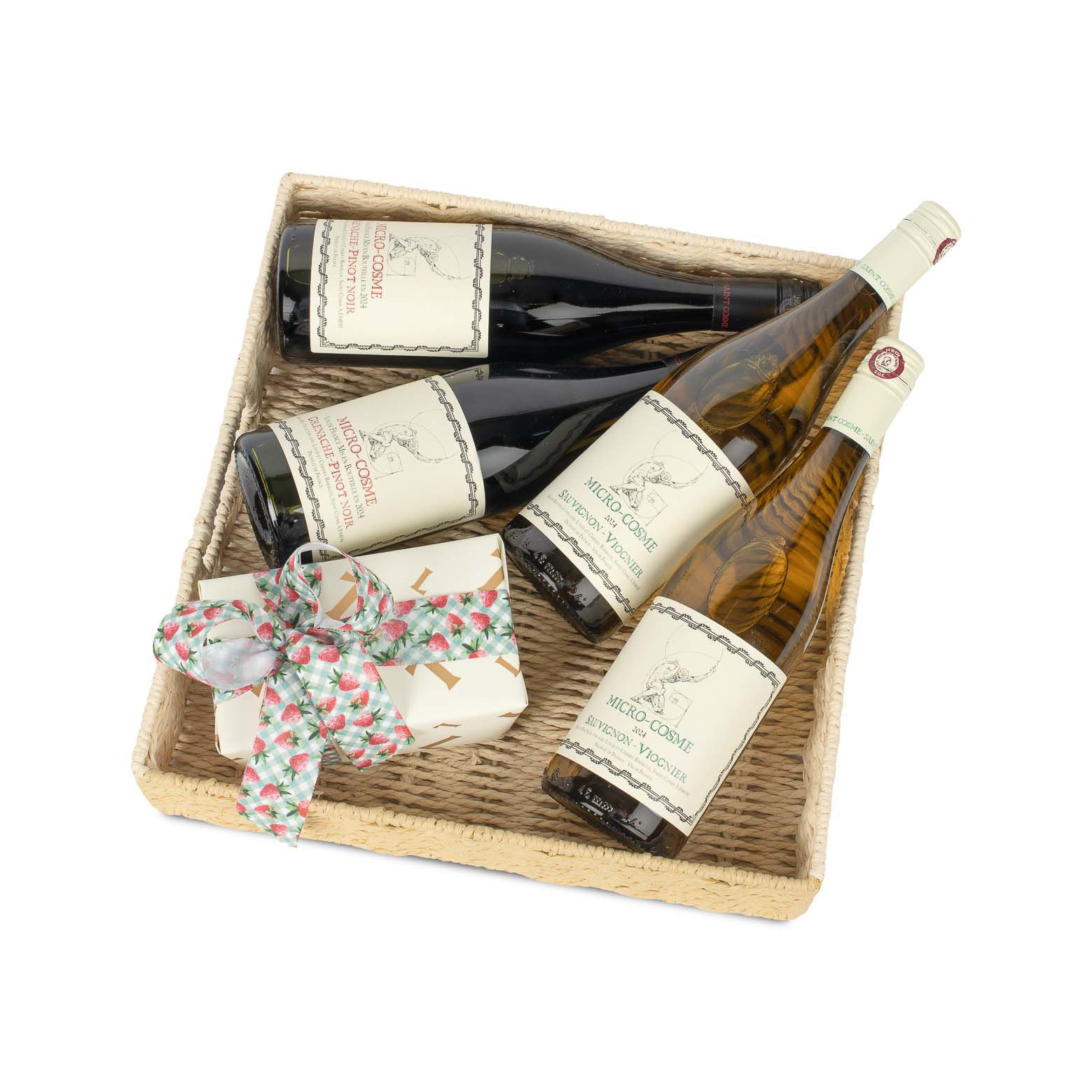Ψάθινος δίσκος με 4 Γαλλικά κρασιά και σοκολατάκια Leonidas