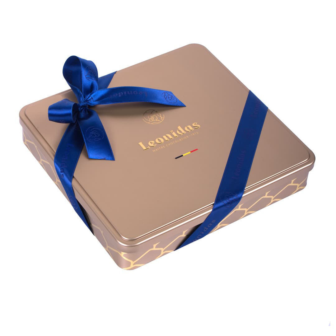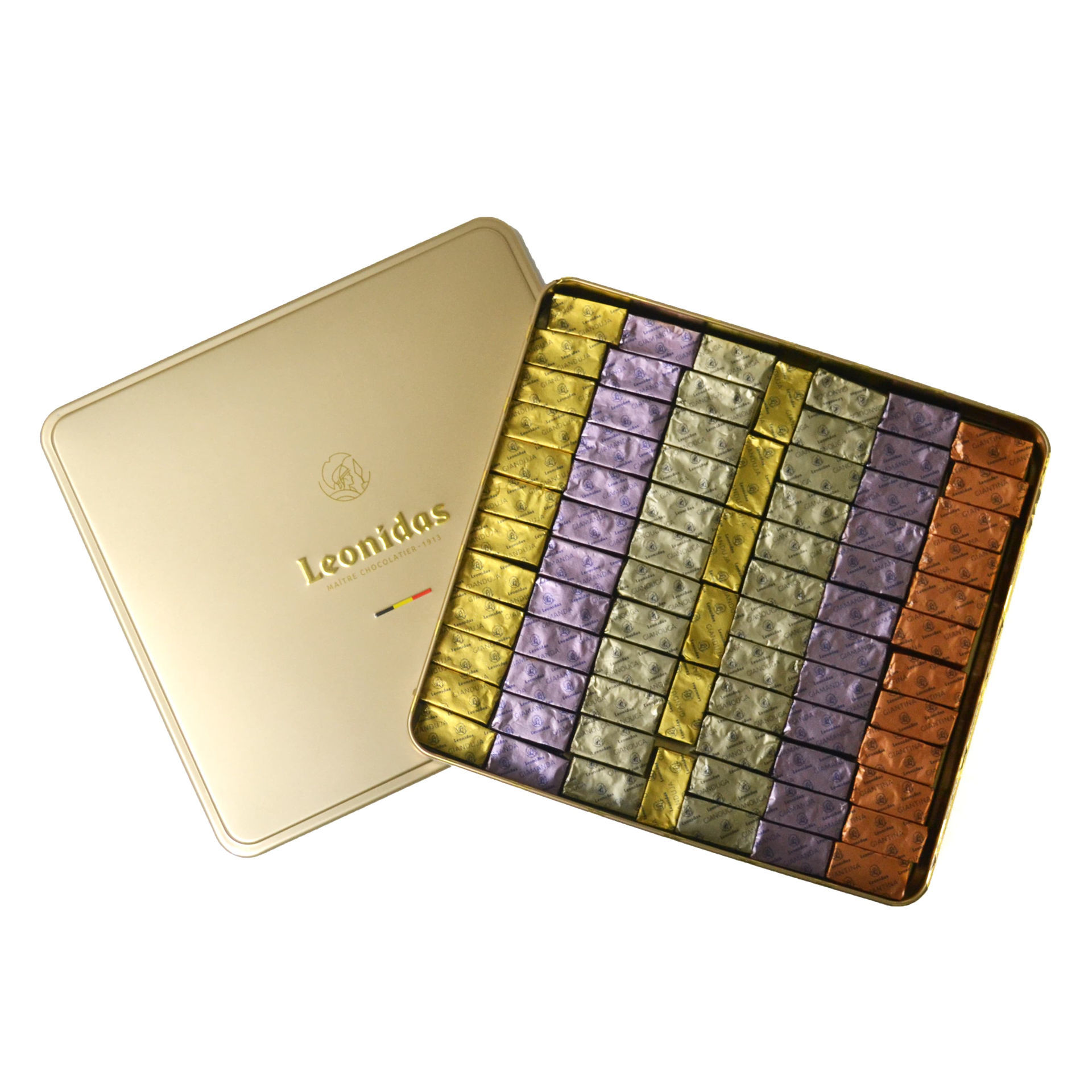 Τετράγωνο χρυσό μεταλλικό κουτί με 1,79 κιλά σοκολατάκια gianduja, giantina, giamanda Leonidas