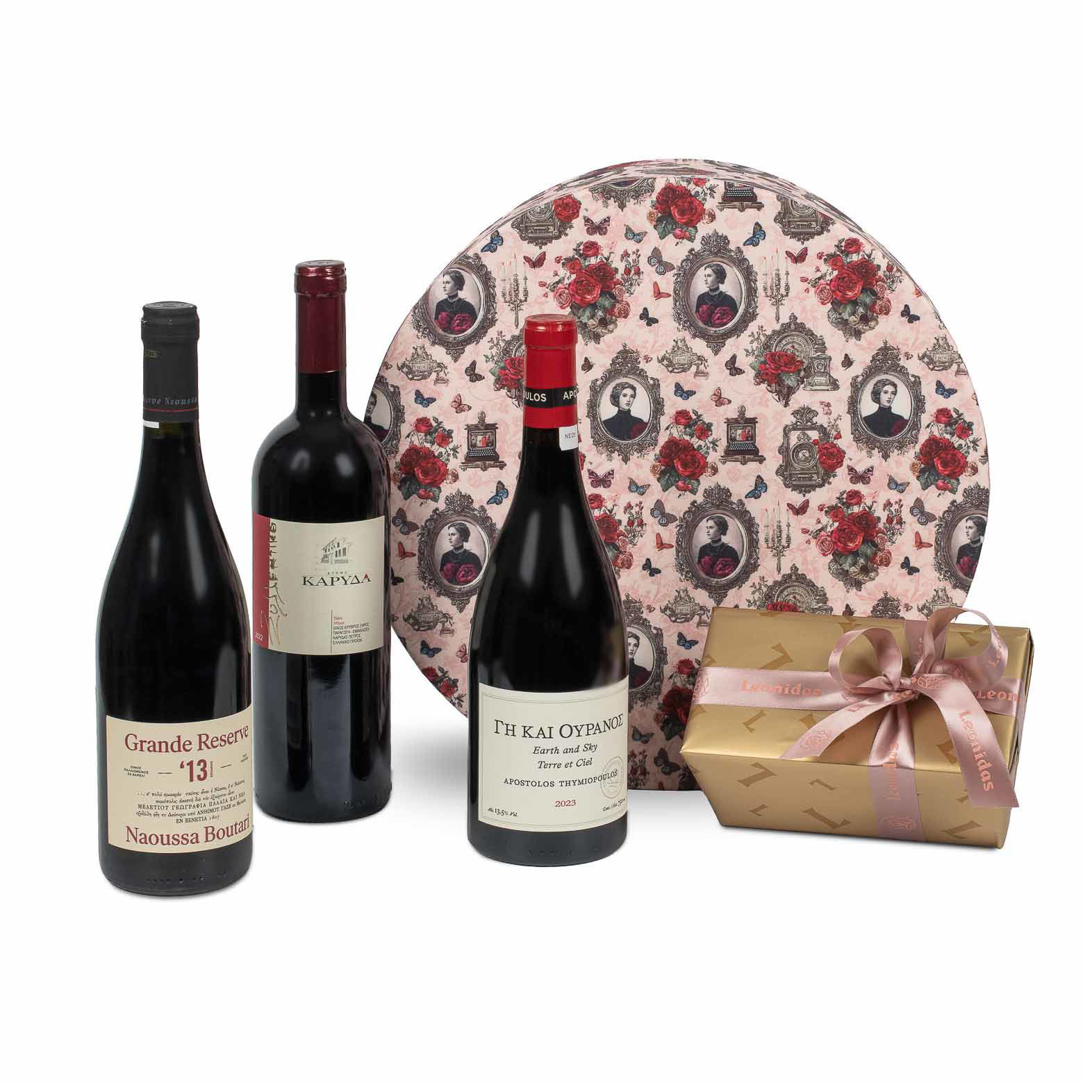 Υφασμάτινη καπελιέρα με 3 κρασιά Ξινόμαυρα και σοκολατάκια Leonidas