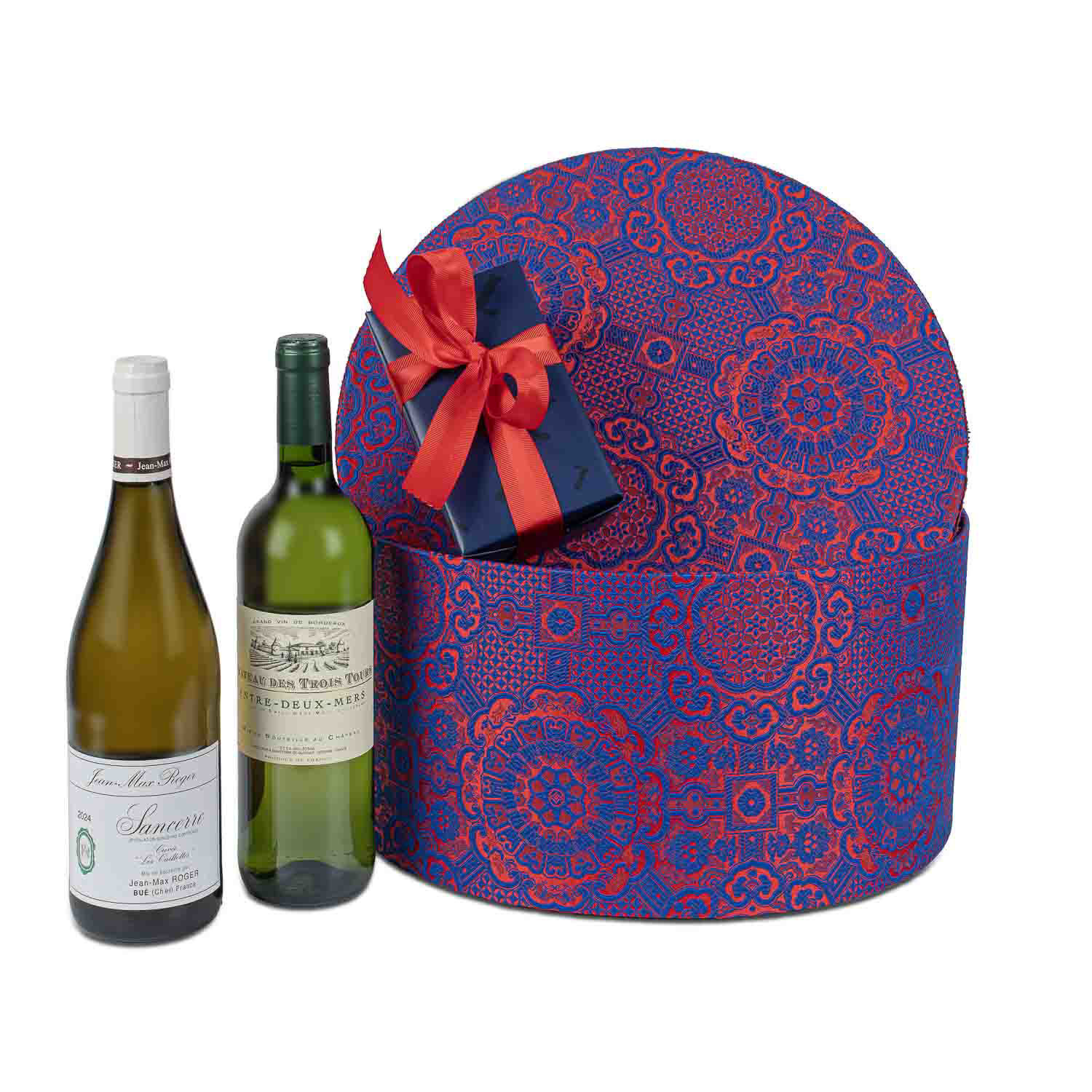 Υφασμάτινη καπελιέρα με Γαλλικά λευκά κρασιά και 750 γρ σοκολατάκια Leonidas