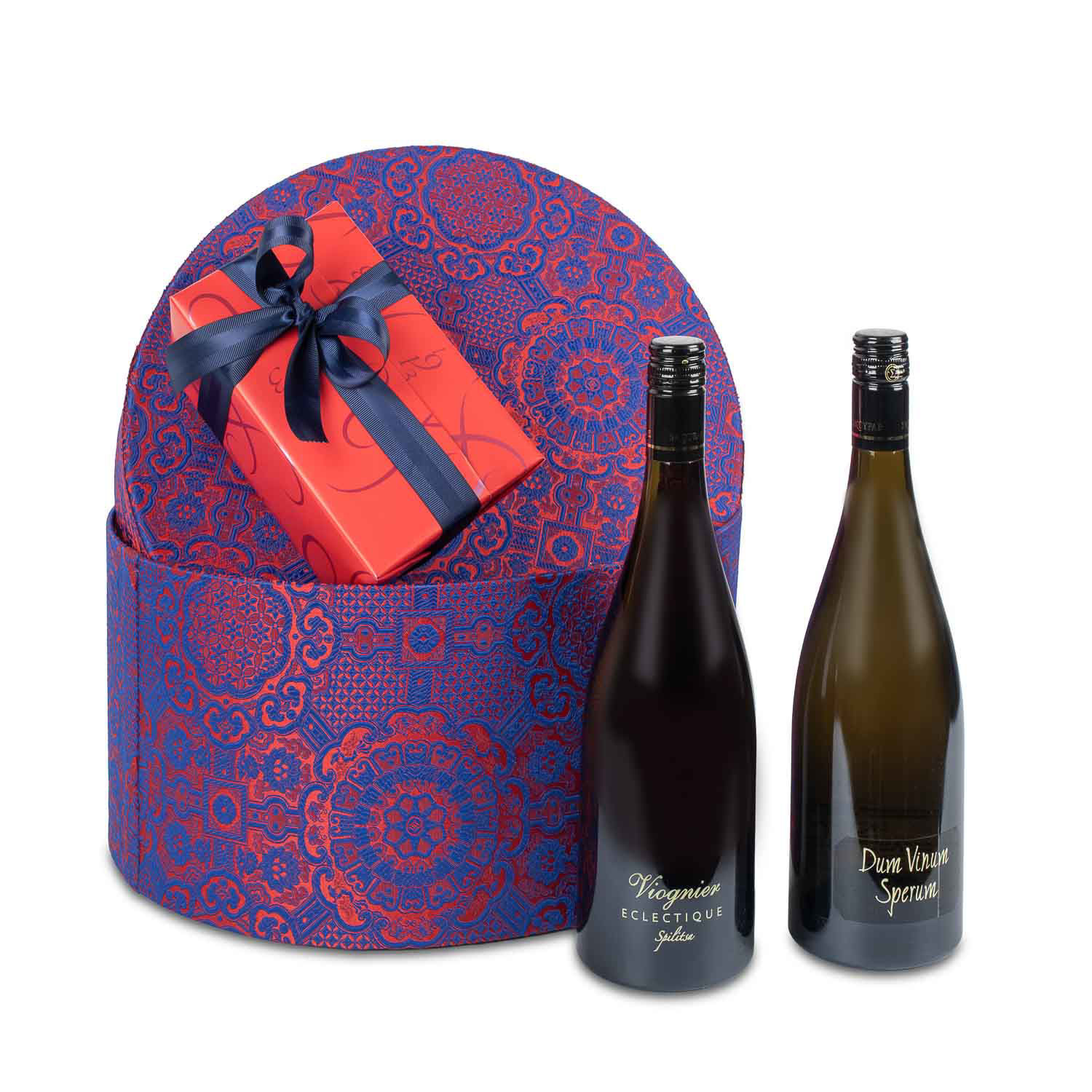 Υφασμάτινη καπελιέρα με λευκά κρασιά Σκούρα και 1 κιλό σοκολατάκια Leonidas